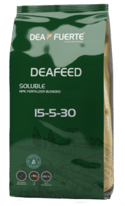 DEAFEED 15-5-30 es un fertilizante NPK soluble, cristalino, con un alto contenido en potasio (K2O), magnesio (MgO), azufre (SO3) y oligoelementos enriquecidos, especialmente pensado para el desarrollo de los frutos, engorde y maduración.